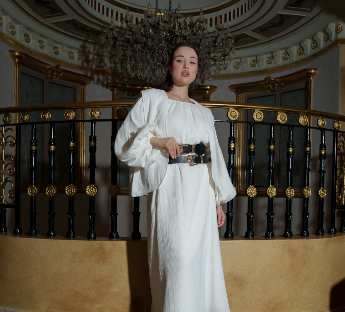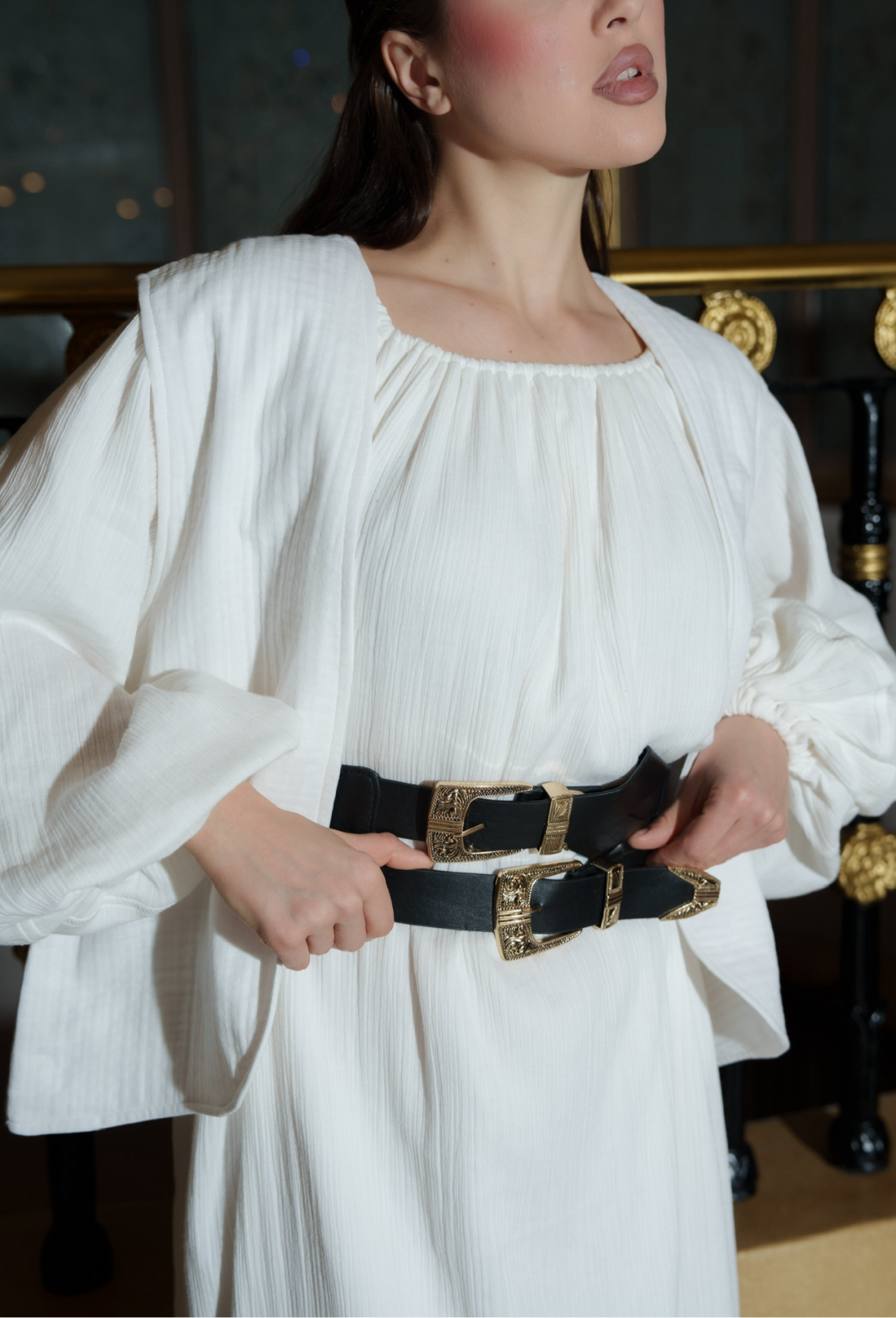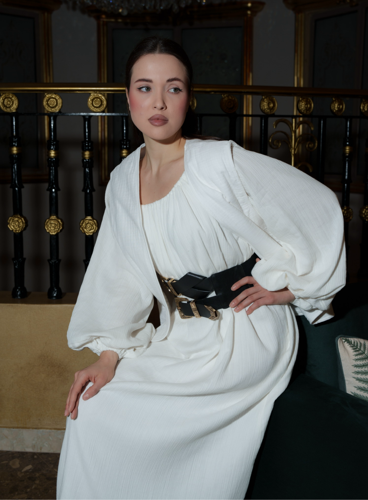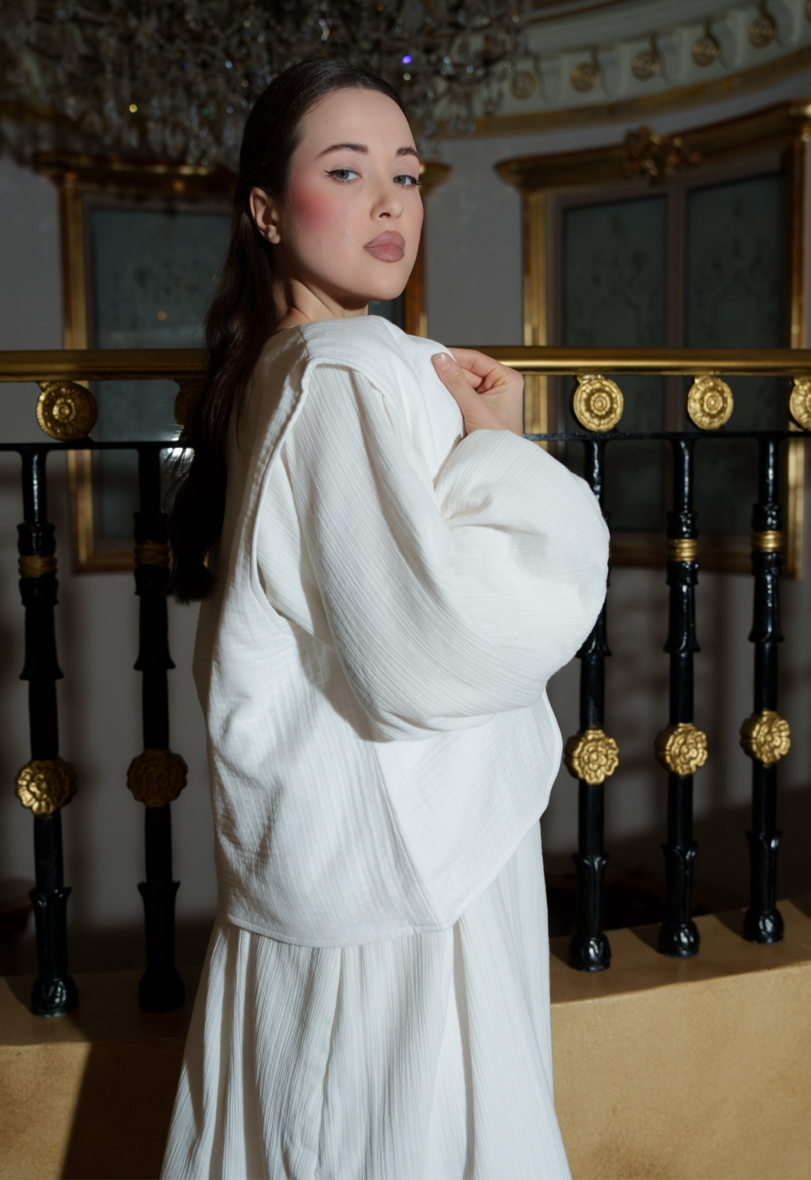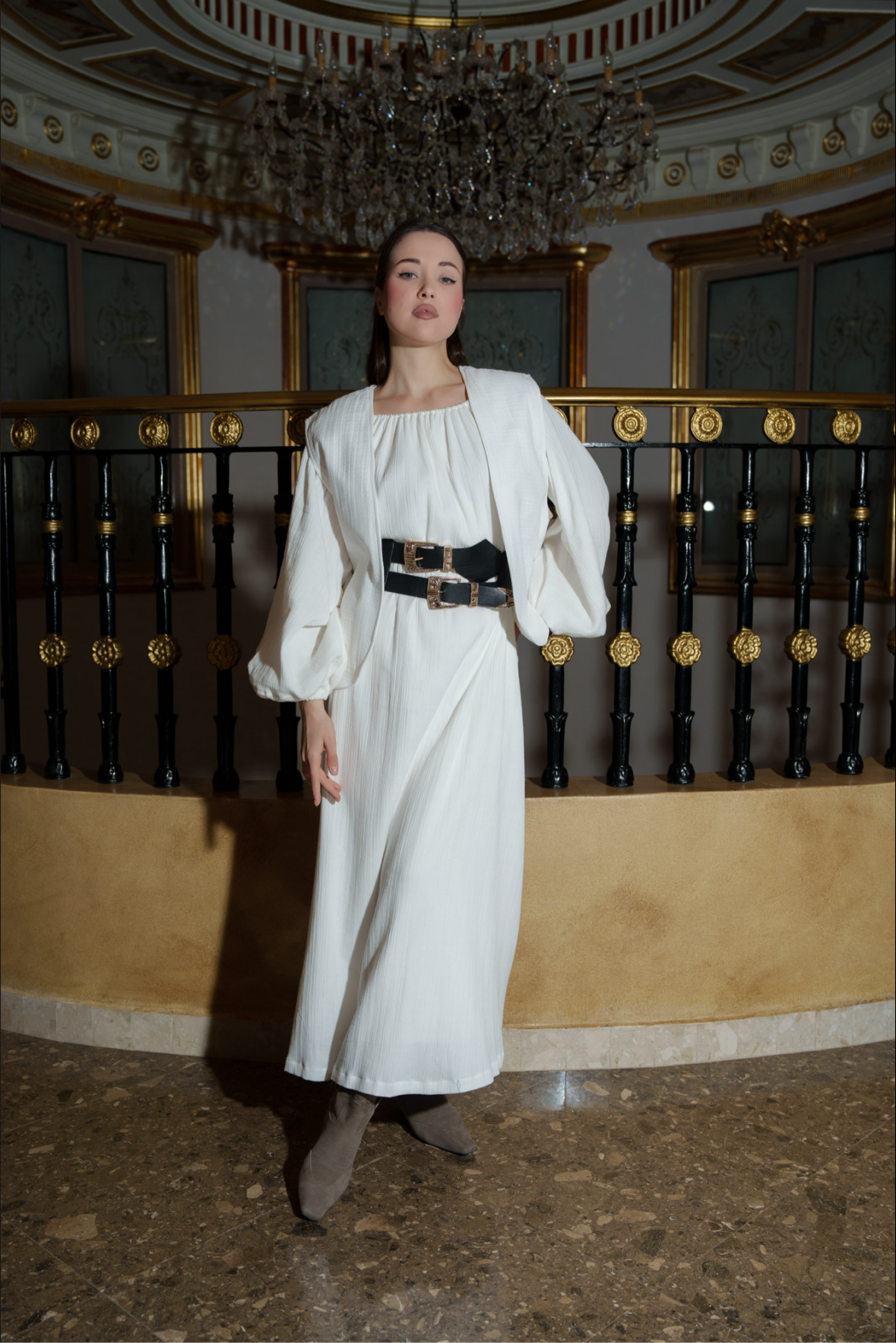 This ivory set features flowing fabric, voluminous sleeves, and a structured belt for a flattering silhouette.