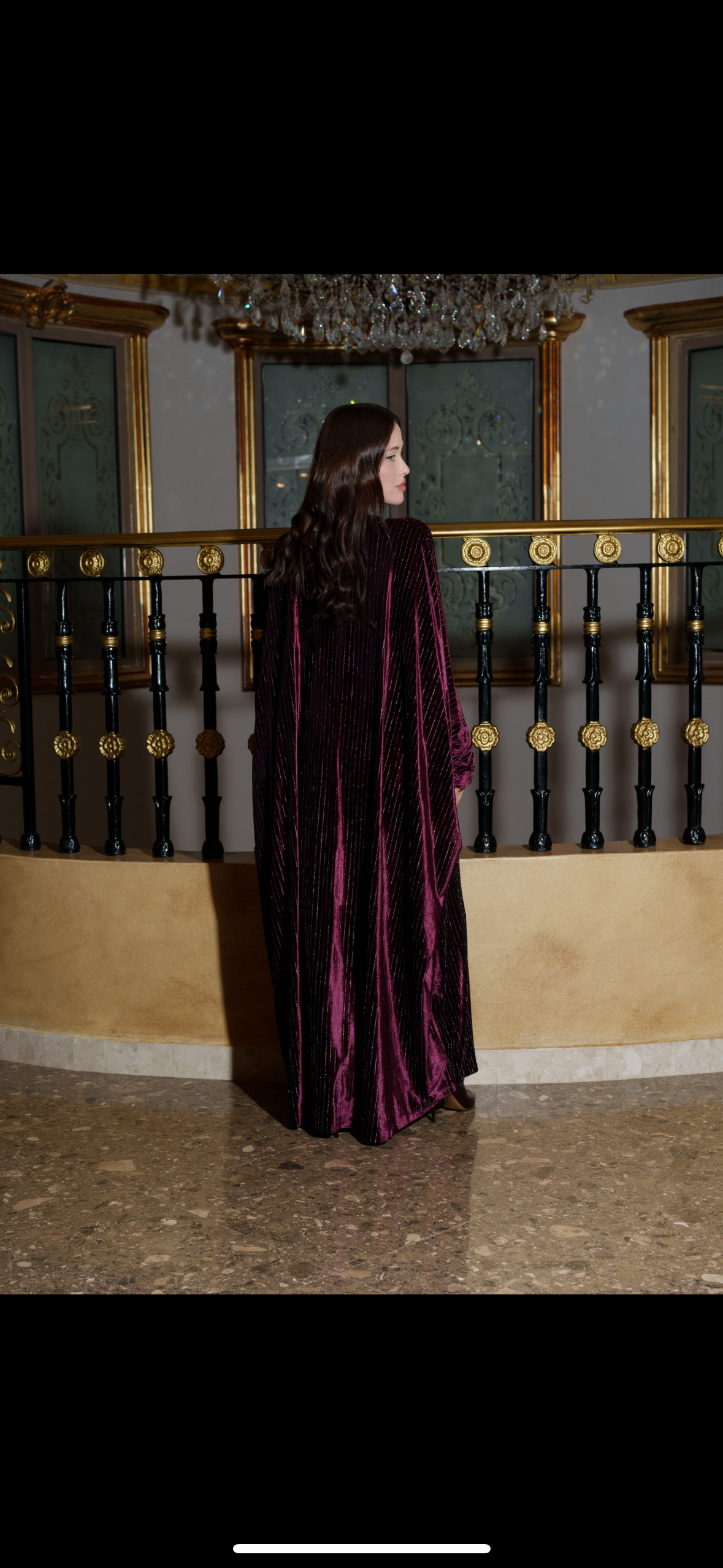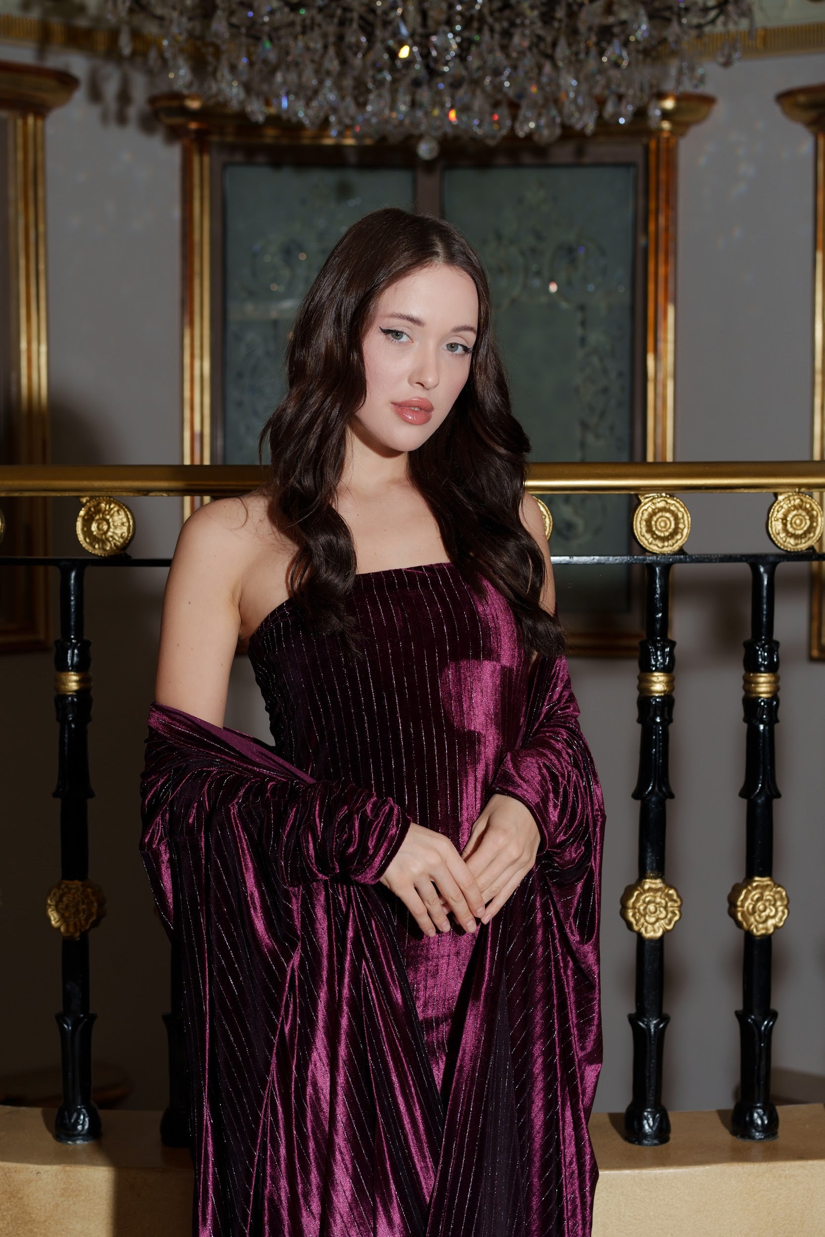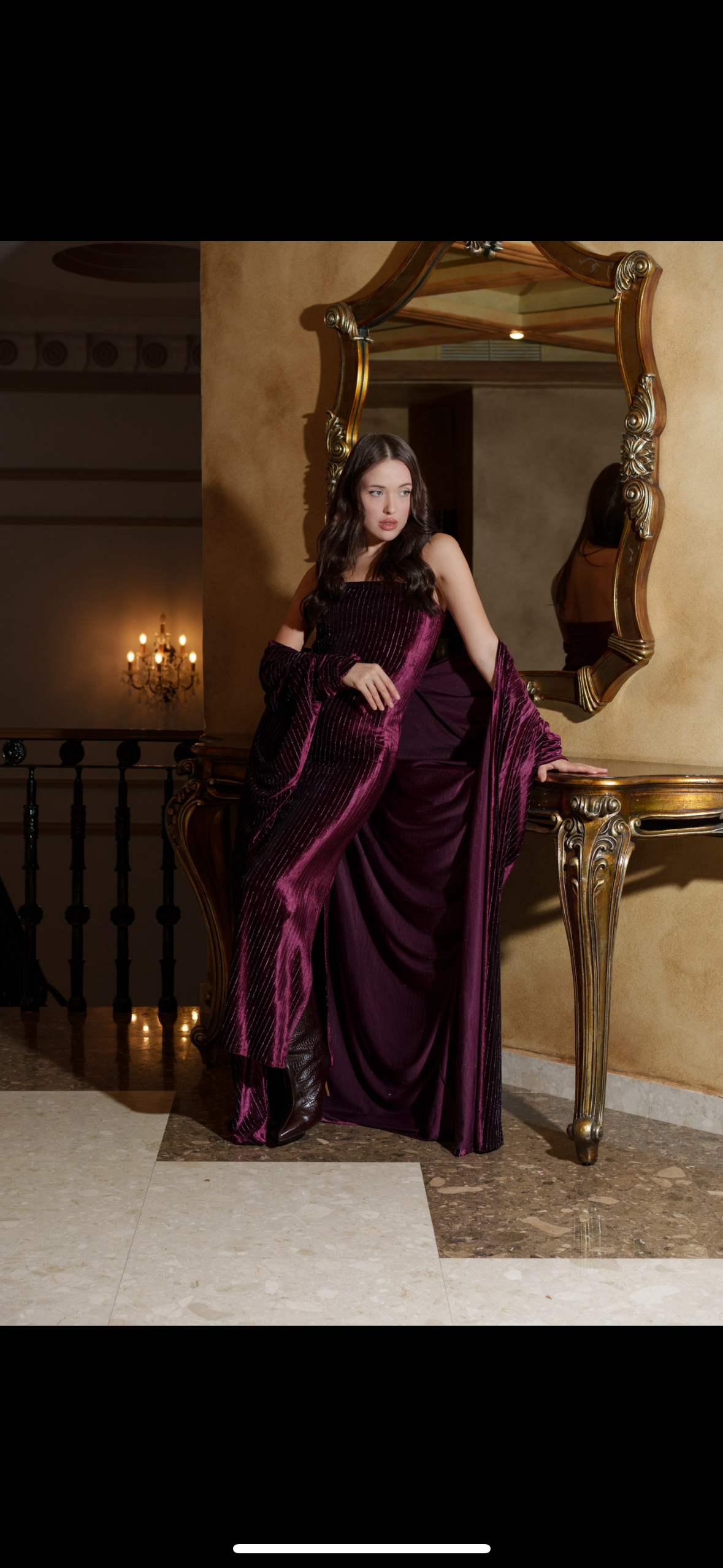 A chic tube dress paired with a matching maxi bisht in rich plum velvet, combining elegance and modern luxury.