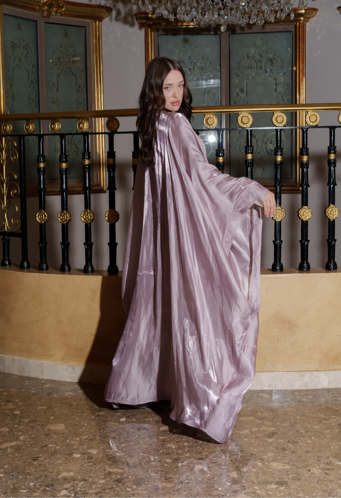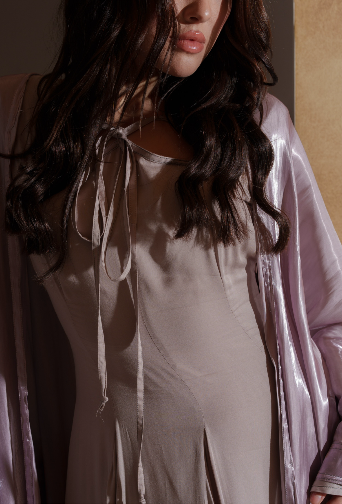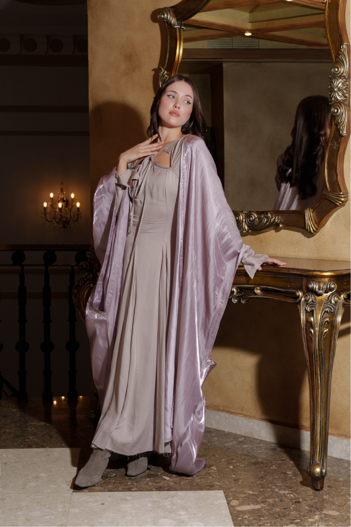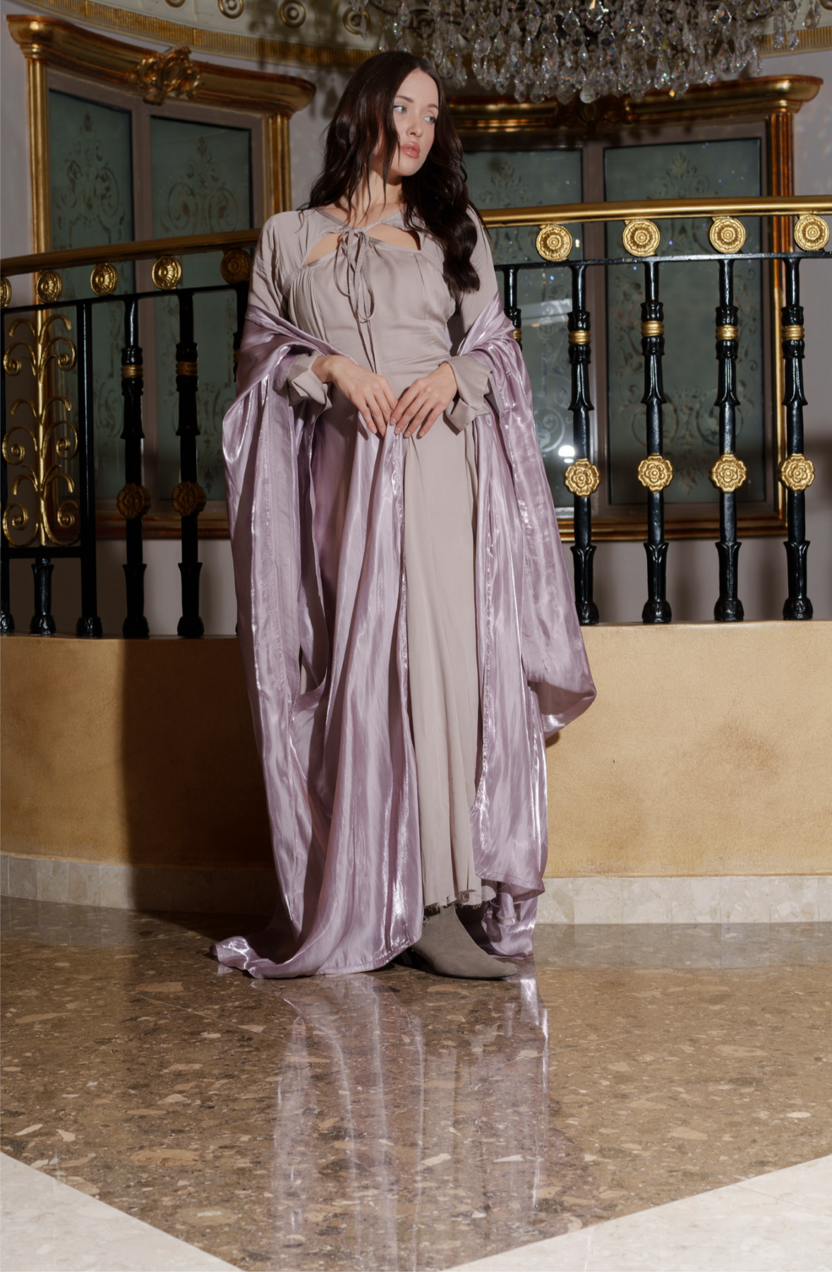 The Ethereal Set blends soft, flowing fabrics with a touch of understated glamour. Featuring a gracefully draped maxi dress paired with a shimmering cape, this look exudes effortless sophistication and timeless charm.