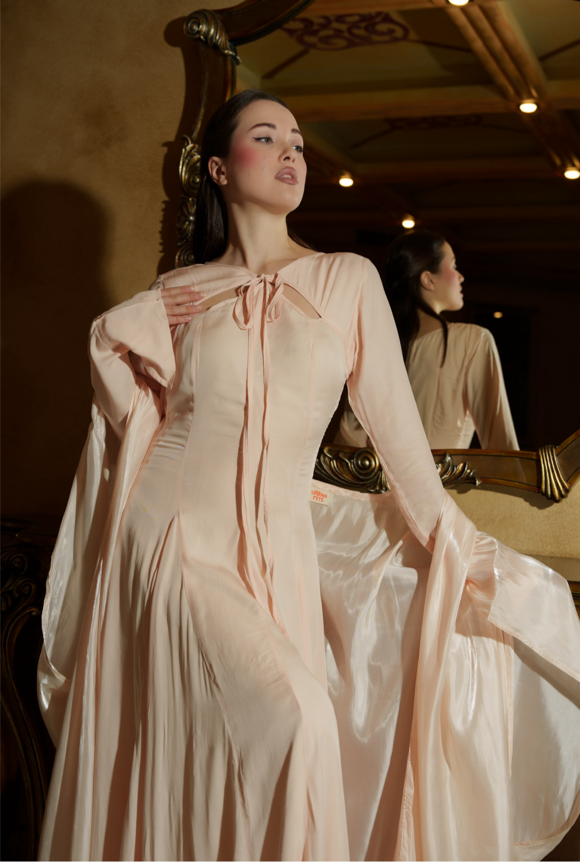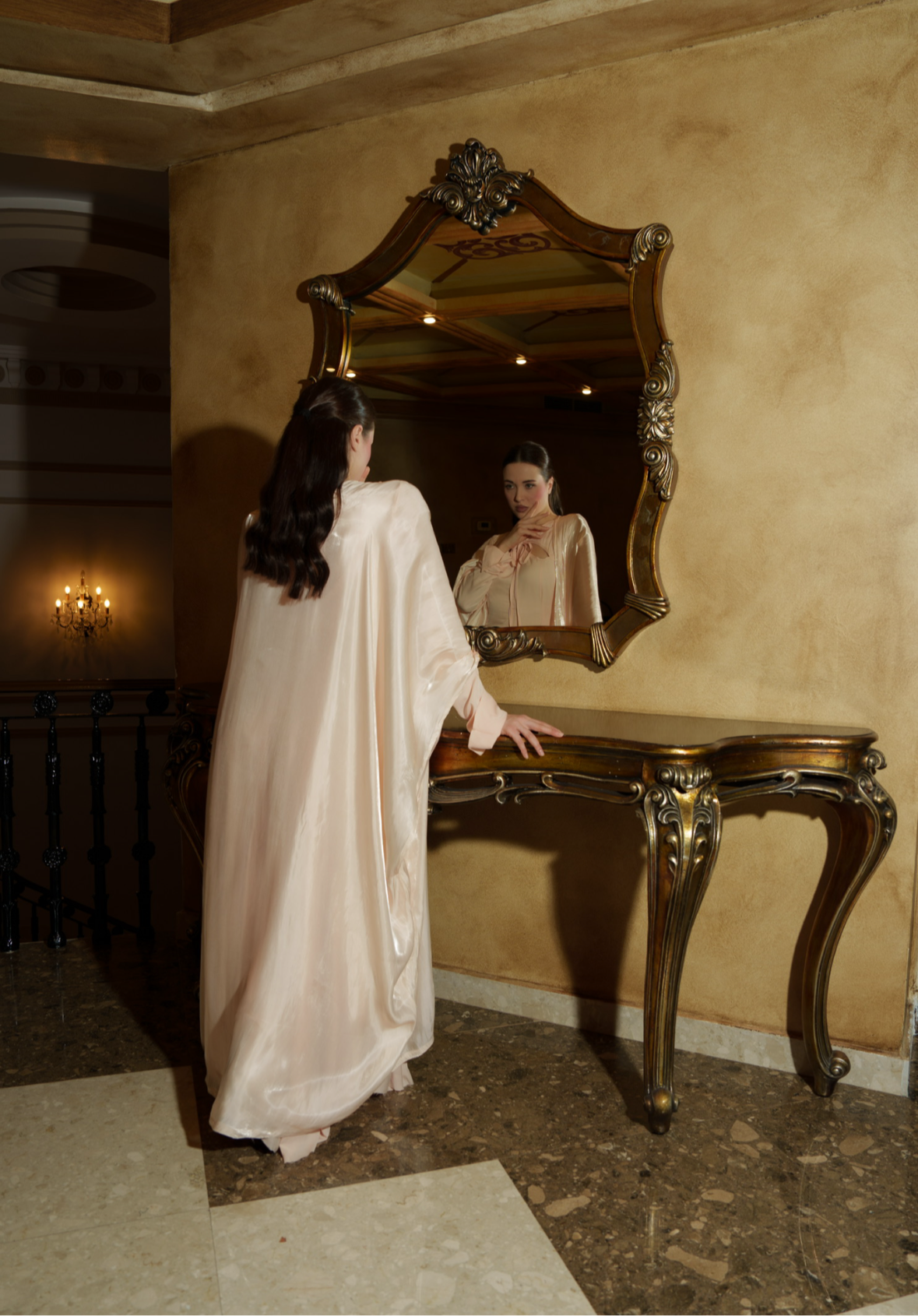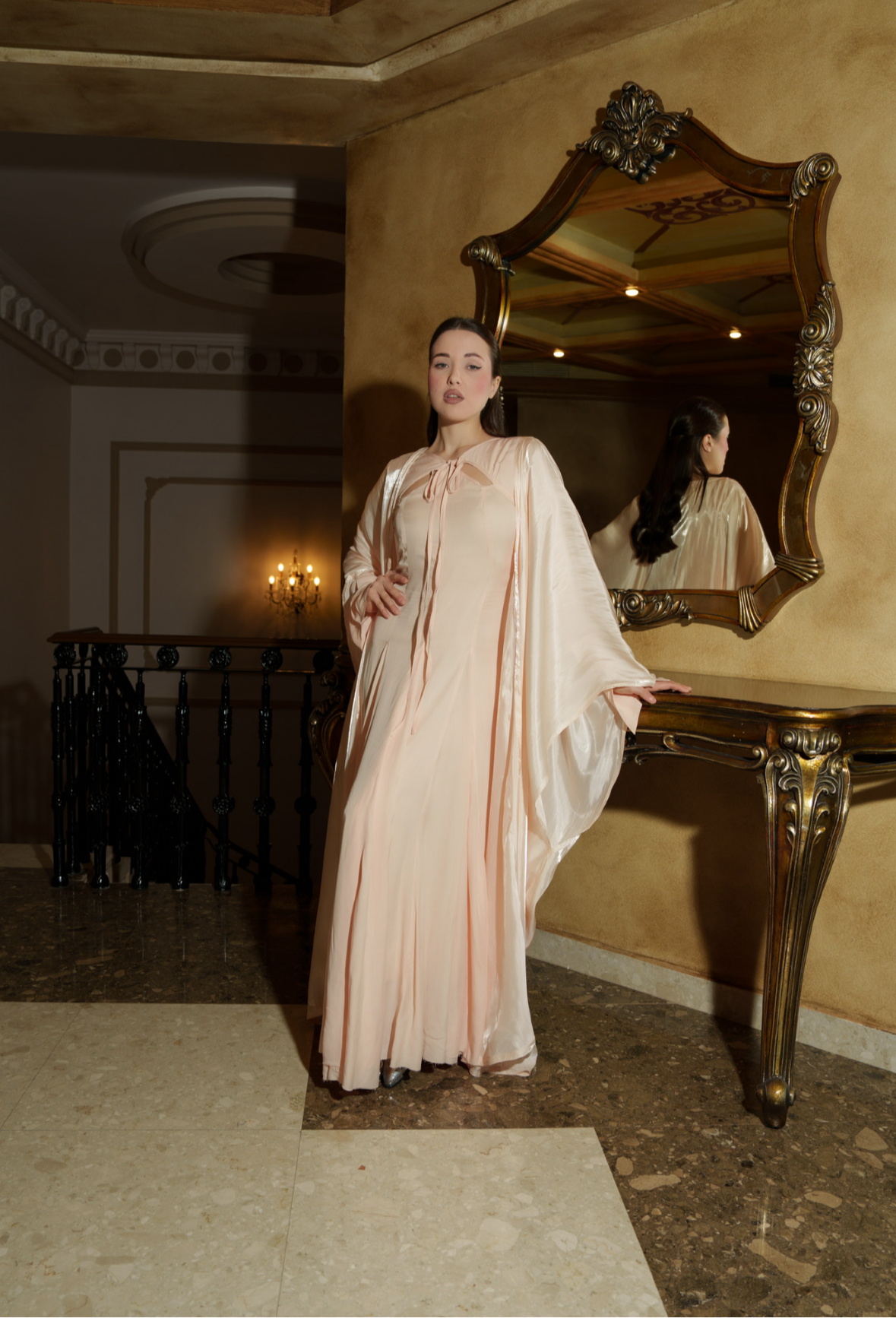 The Ethereal Set blends soft, flowing fabrics with a touch of understated glamour. Featuring a gracefully draped maxi dress paired with a shimmering cape, this look exudes effortless sophistication and timeless charm.