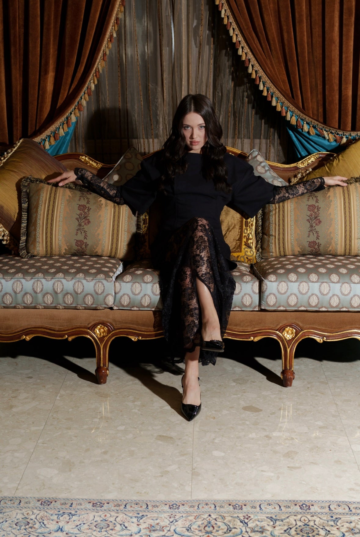 A sophisticated all-black ensemble featuring a structured mini dress layered over a sheer lace dress.