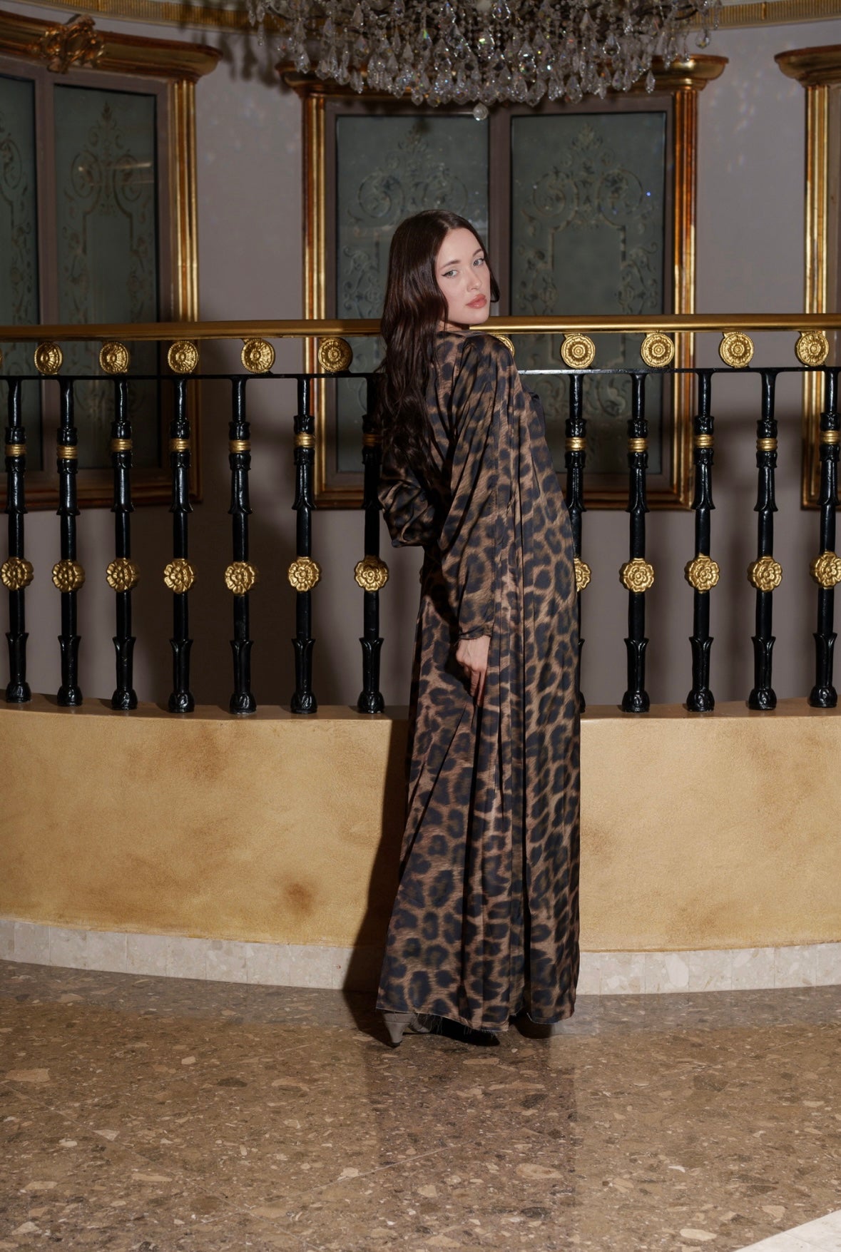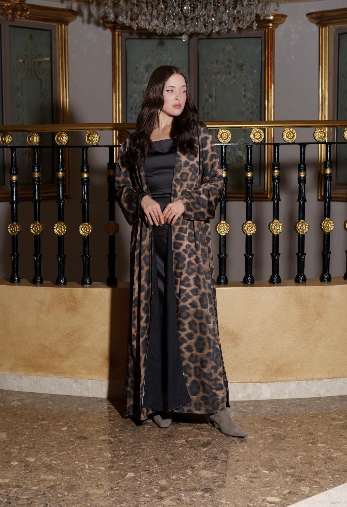 This striking two-piece set features a sleek black satin slip dress paired with a bold animal-print kimono. The perfect combination of elegance and edge.