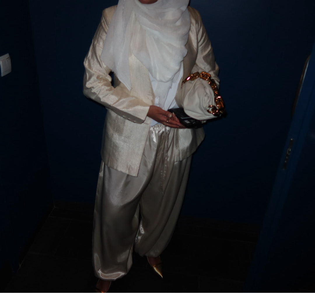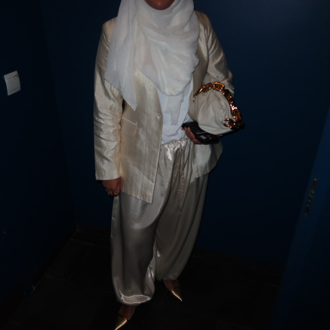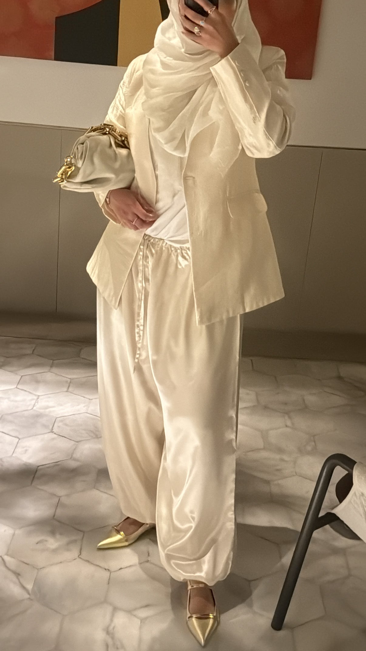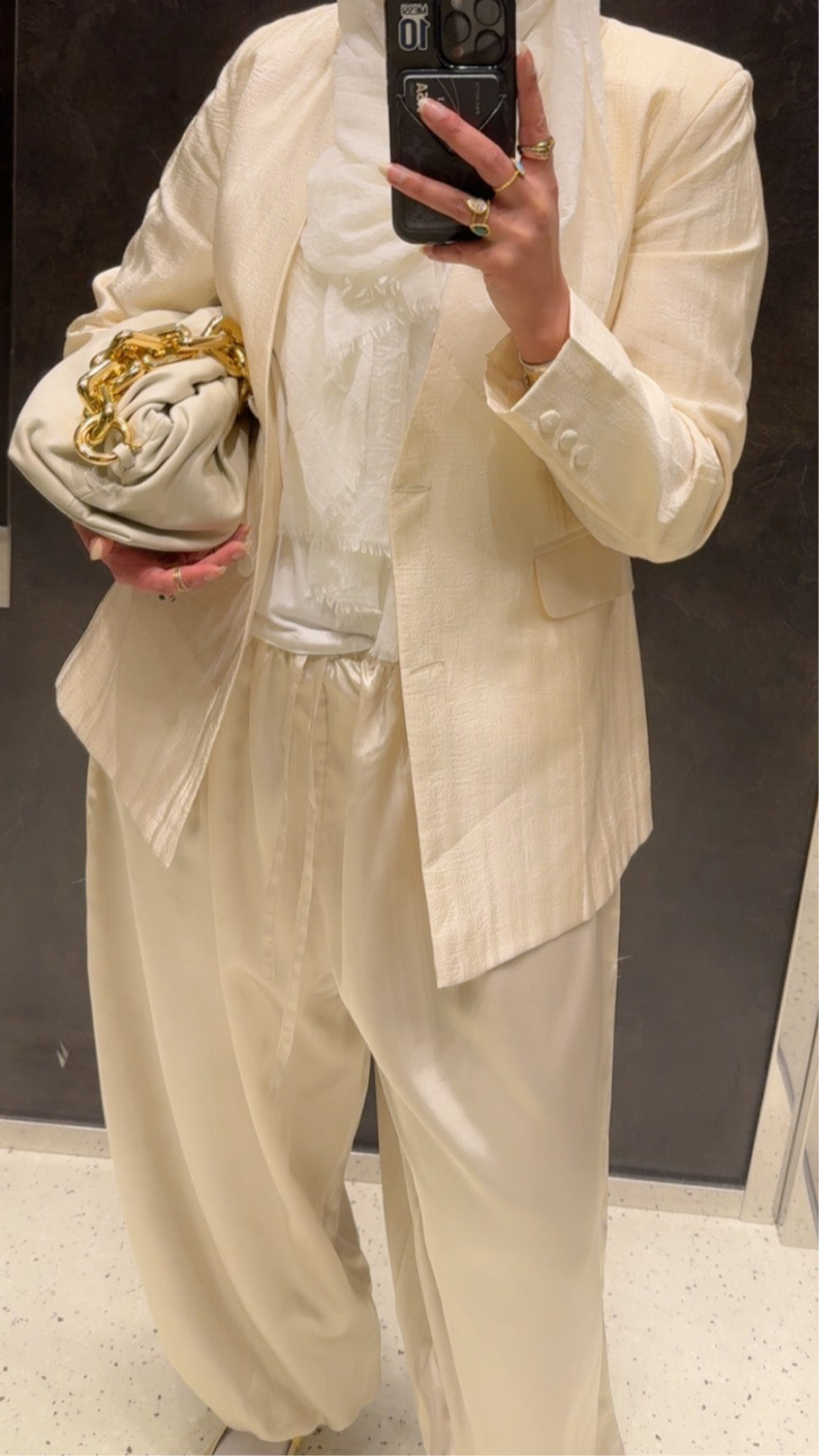 This set pairs a relaxed-fit blazer with fluid, balloon trousers in a soft, lustrous fabric. Effortlessly chic and versatile, it moves seamlessly from day to night with understated elegance.