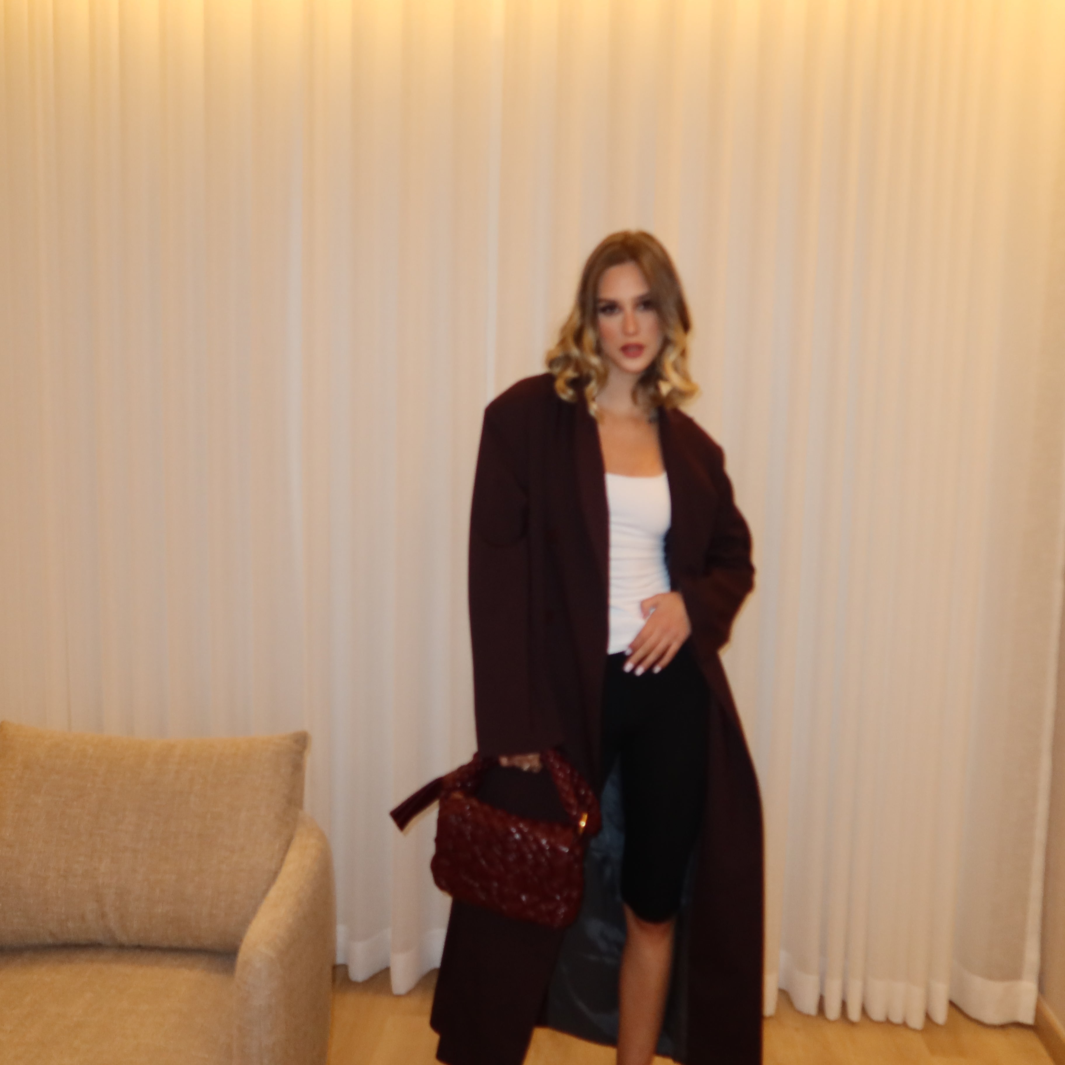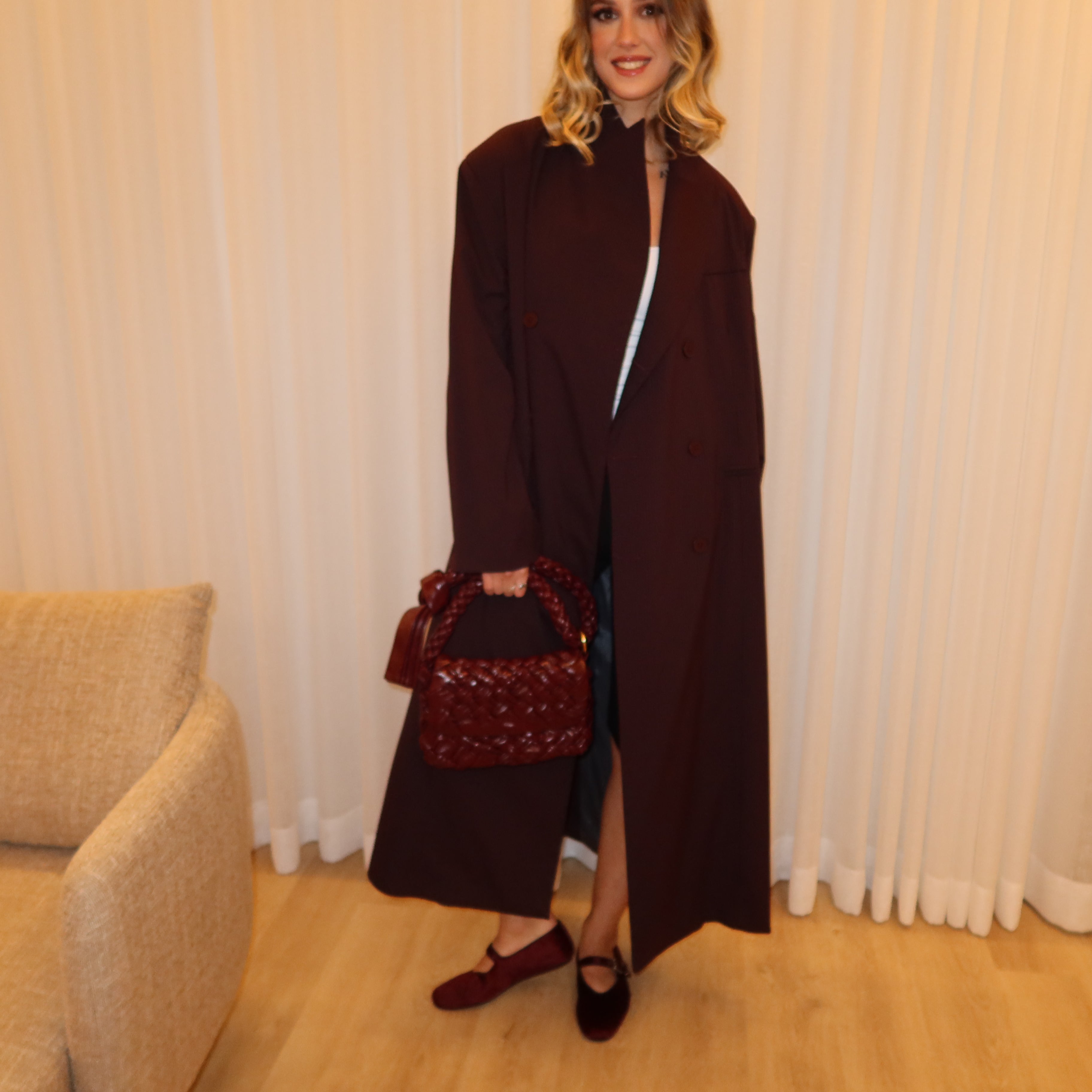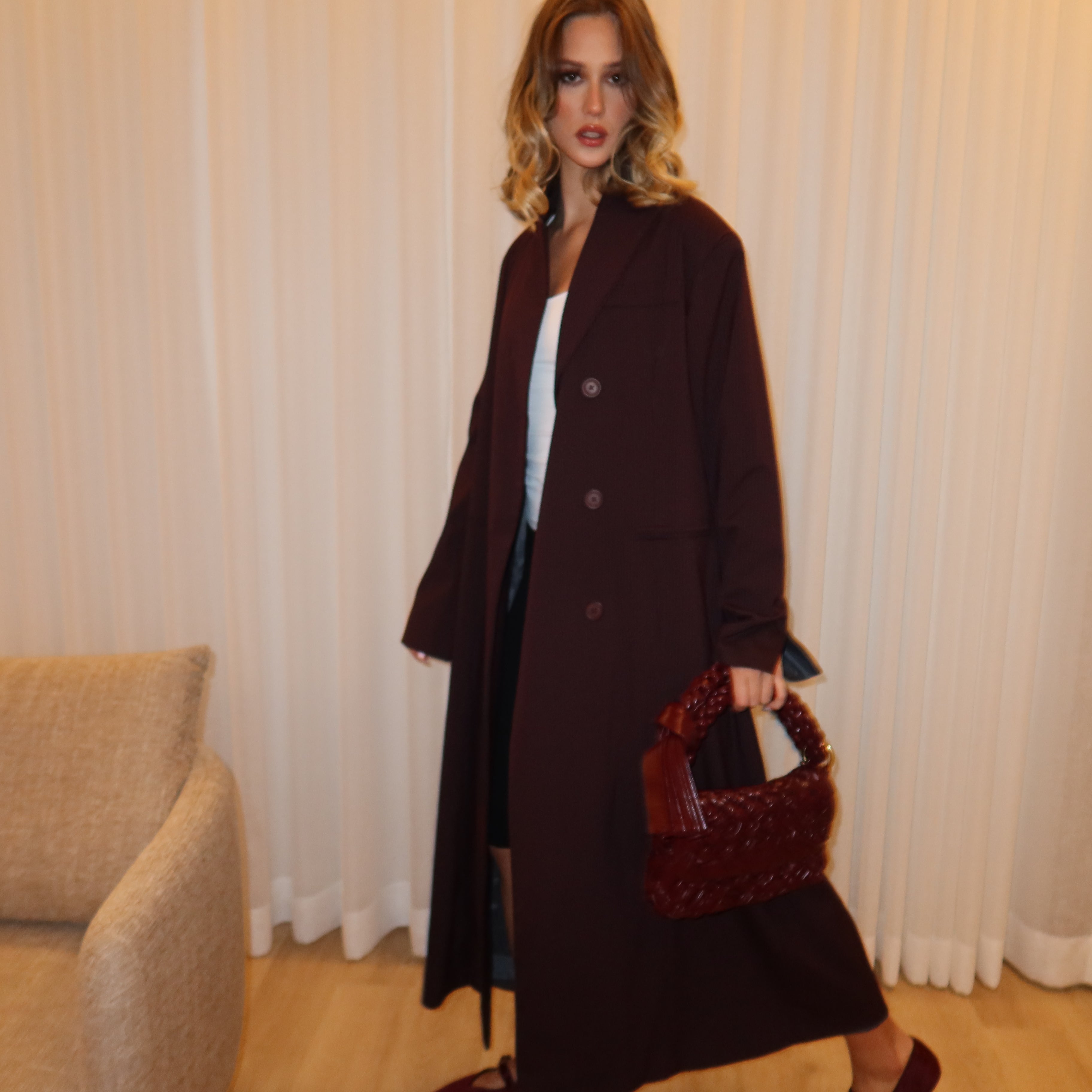 A sleek, oversized longline coat with a structured silhouette, perfect for layering with a polished finish.