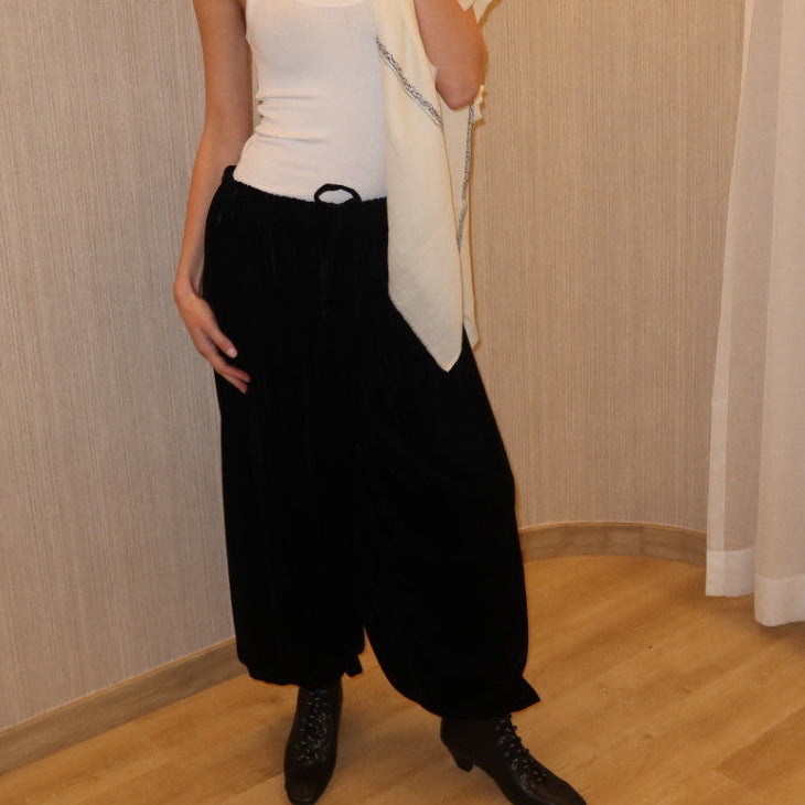 Voluminous velvet pants with a fluid drape and effortless shape. A statement piece with ease.