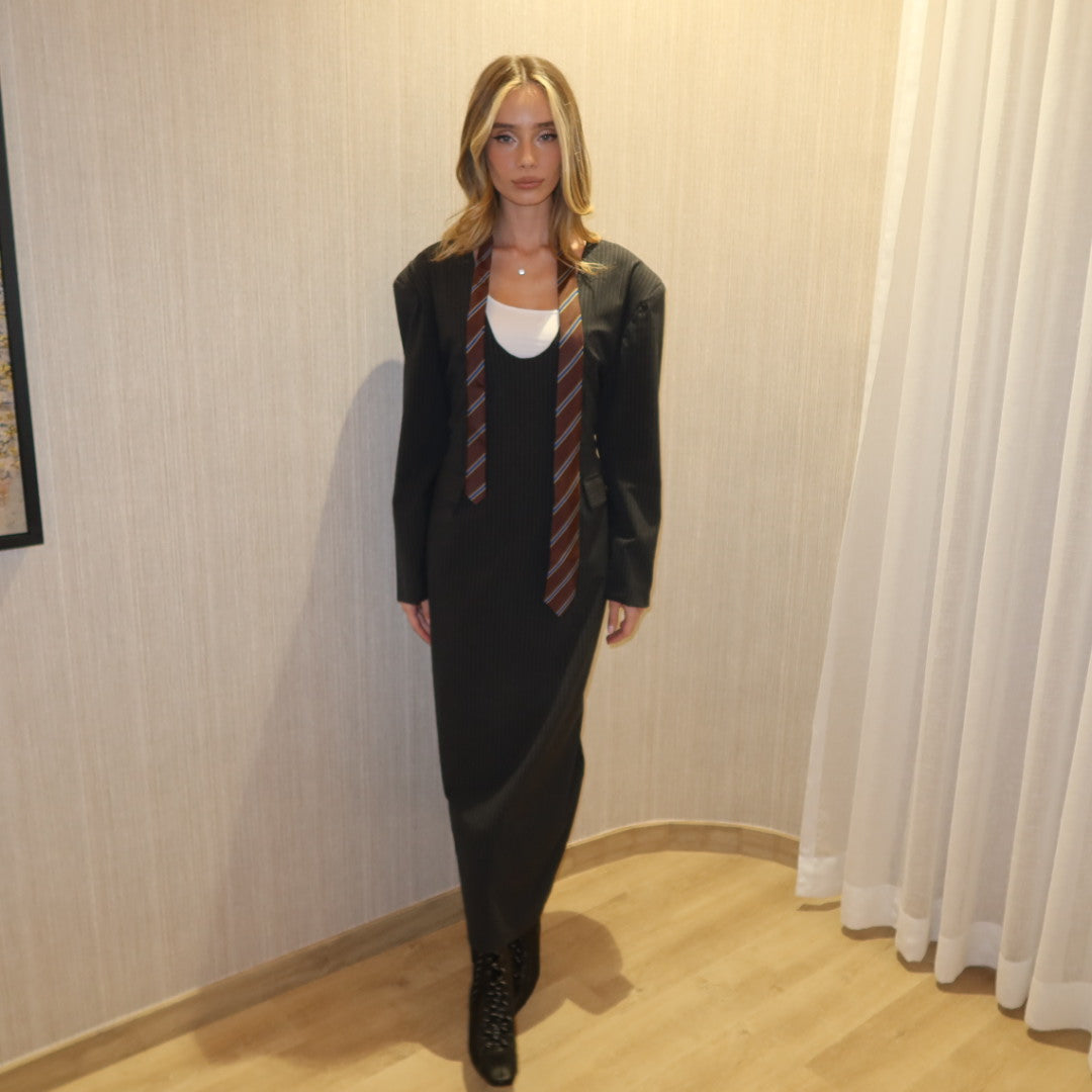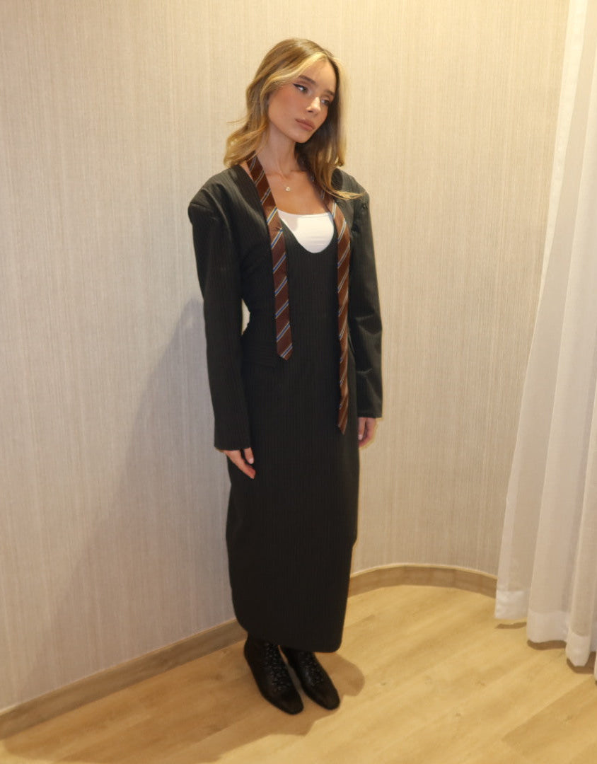 Menswear-inspired tailoring meets a fluid dress base — sharp shoulders, soft drape, and understated confidence.