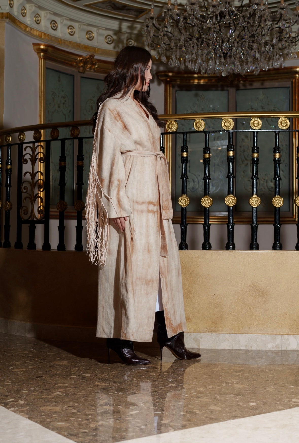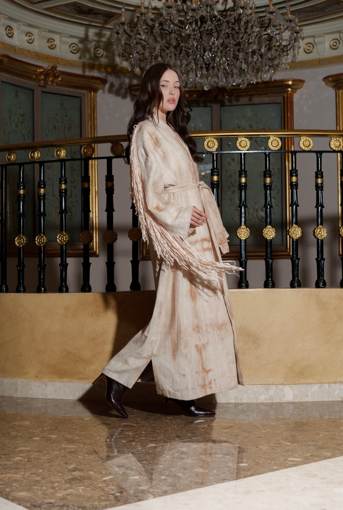 This tie-dye-inspired kimono blends elegance and artistry, featuring soft fringe detailing and a belted waist for a versatile, flowy silhouette. Perfect for layering with effortless style.
